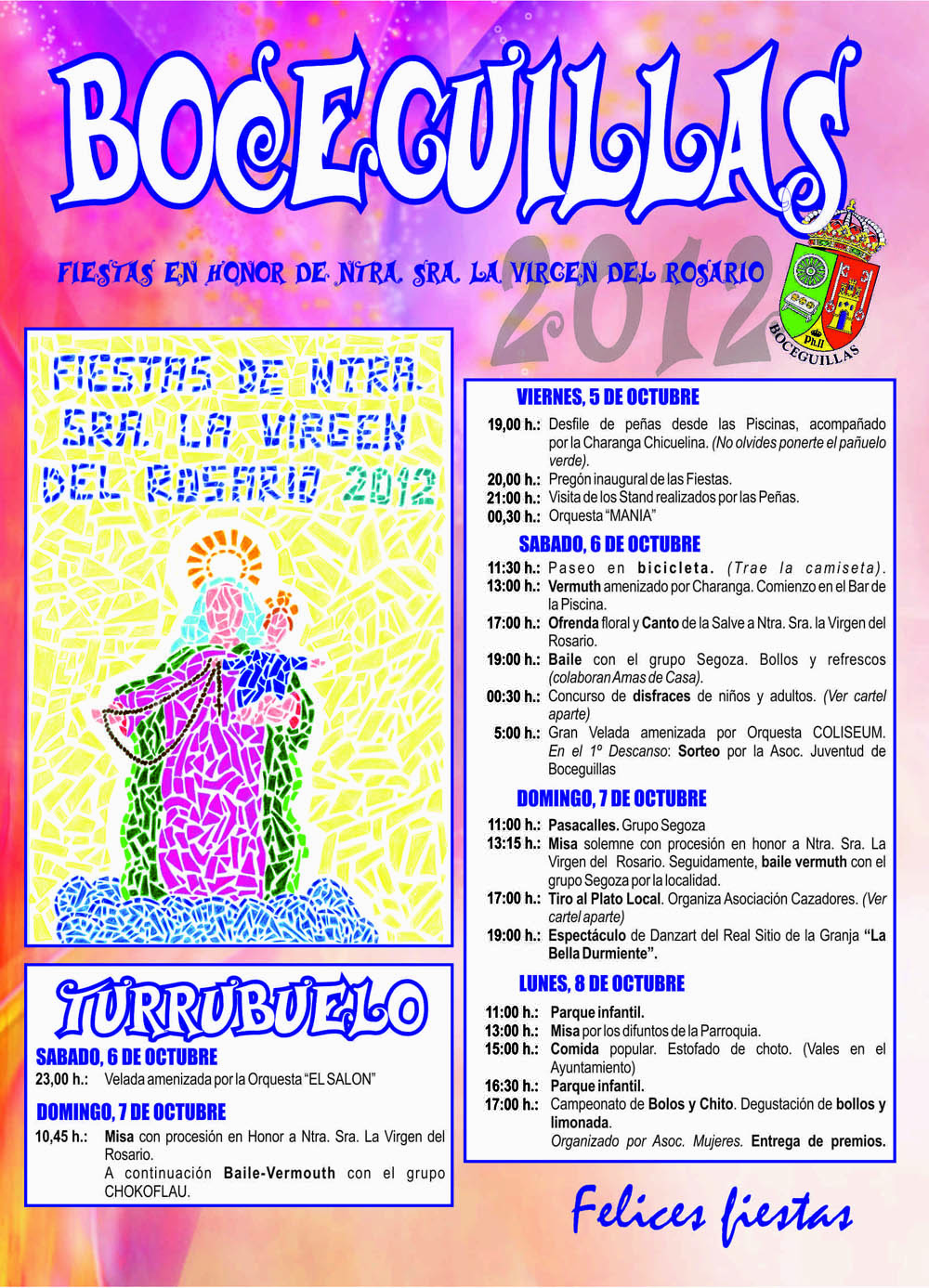 Los próximos días 5, 6, 7 y 8 de octubre la Villa de Boceguillas celebra sus fiestas patronales en honor a la Virgen del Rosario. Se ha elaboración un programa de fiestas con actividades para todos, niños y mayores. Os deseamos FELICES FIESTAS.