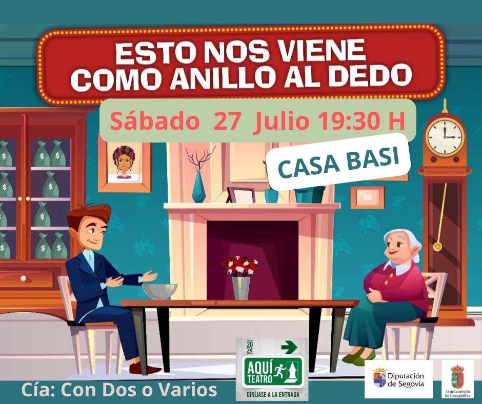 El próximo sábado 27 de julio a las 19:30 horas, en la Plaza de España de Boceguillas se representará la obra de teatro "Esto nos viene como anillo al dedo" a cargo del grupo de teatro Con Dos ó Varios.